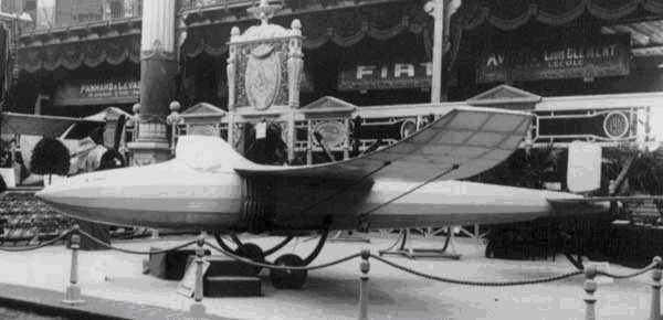 Nicht Tatin, er benutzte 1879 für den Antrieb Druckluft. Und das ist das einzigartige an diesem Fluggerät. Das Modell in nachfolgender Abbildung war in seinen Abmaßen im Vergleich zu Moy’s Fluggerät relativ klein. Seine Spannweite betrug 1,90 m und die maximale Flächentiefe maß 40 cm, sodass die Tragflügelfläche von nur 0,70 m² zugrunde gelegt werden kann. Die Tragfläche war in zwei gleiche Hälften geteilt, die beidseitig an einen Metallzylinder mit konisch abschließenden Enden montiert waren. Die Flächen selbst waren mit Industrieseide bespannt.